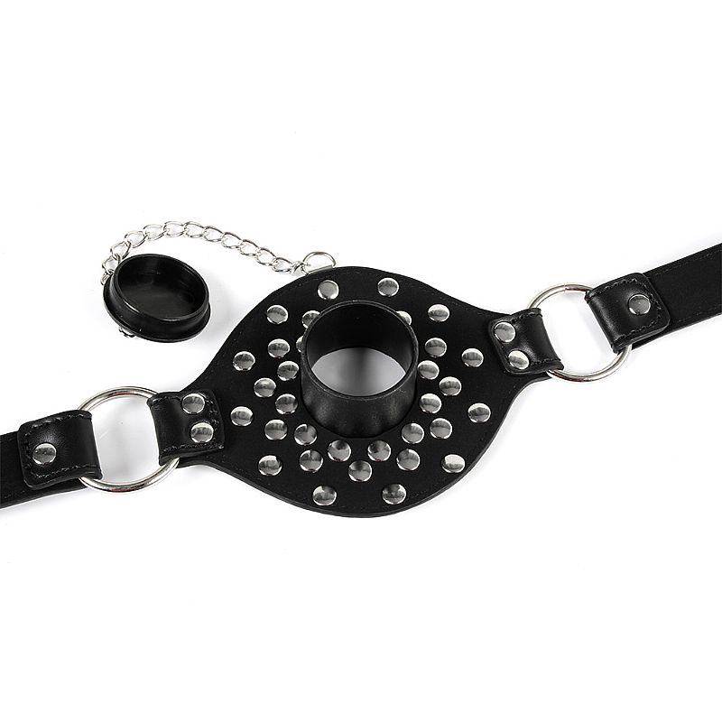 Mordaça bondage ajustável por meio de fivelas metálicas, confeccionada em couro sintético.